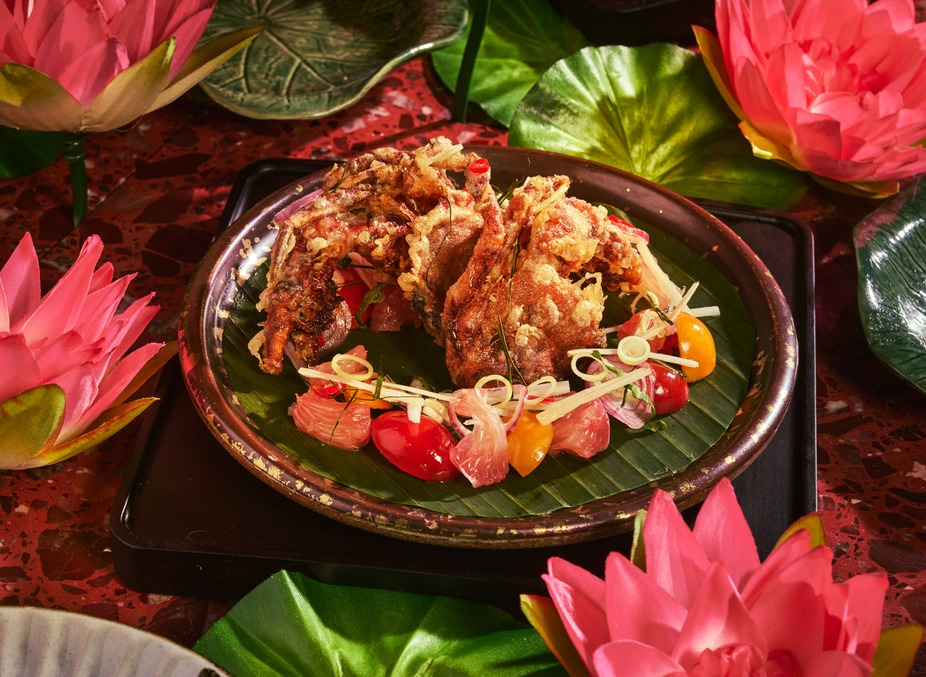 Crisp fried soft-shell crab with lotus stem, pomelo, gooseberry, and cherry tomato, with Thai
