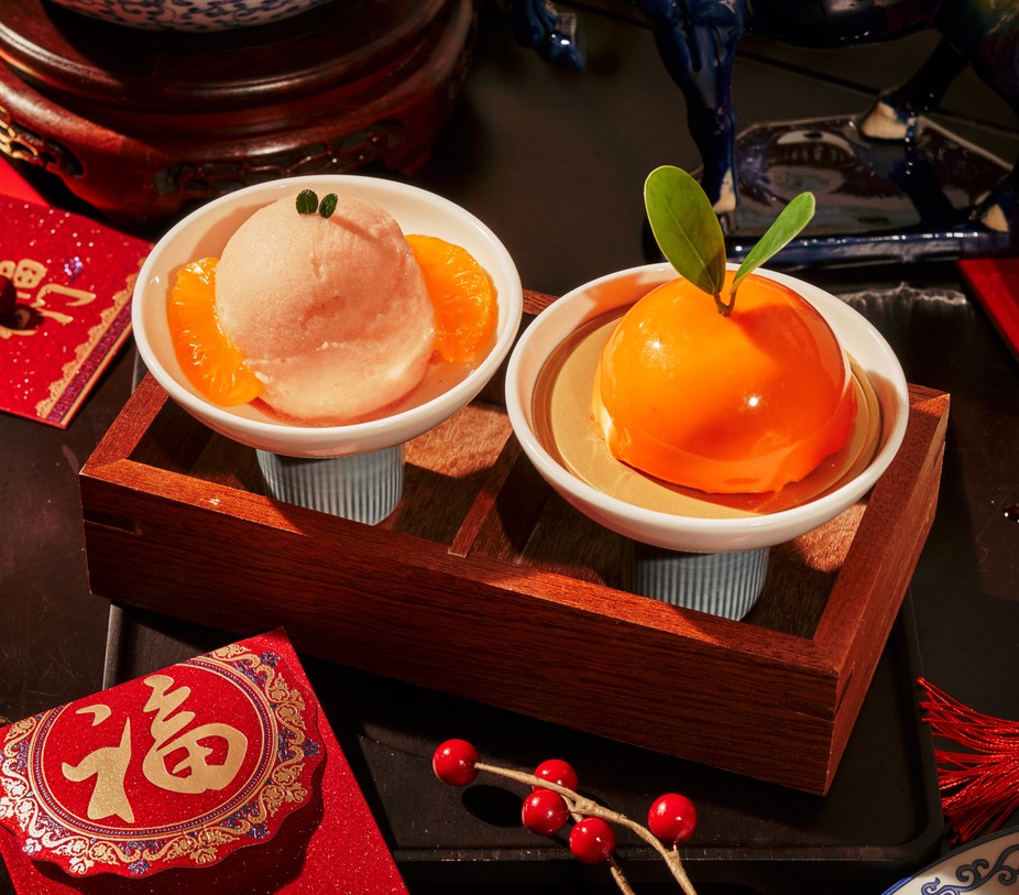 Light mousse cheesecake filled with bright orange-yuzu confit, served with refreshing mandarin sorbet.