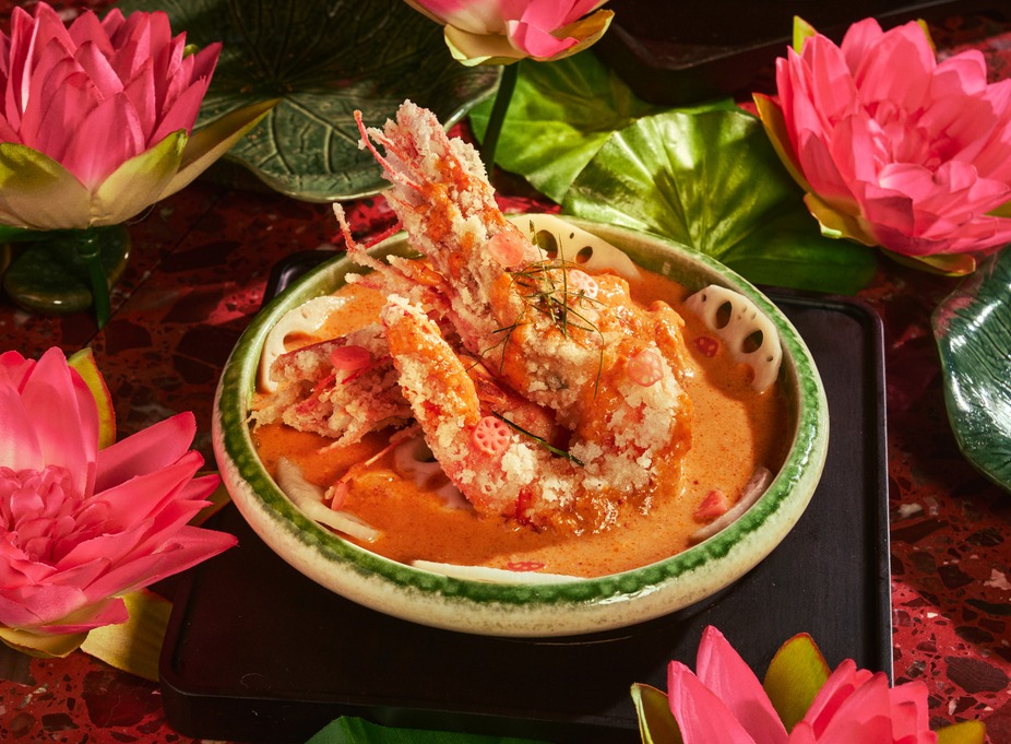 Golden-fried tiger prawns in aromatic red curry with lotus root, finished with kaffir lime leaf