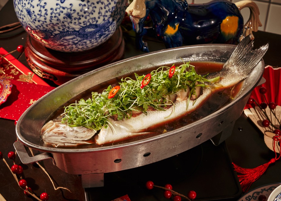 Steamed whole fish with pickled plum and soy, delicately garnished with scallions, celery, and pepper.