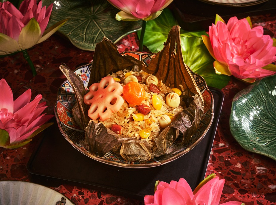 Fragrant soy-seasoned rice steamed in lotus leaf with gingko nuts, lotus seeds, Chinese pork