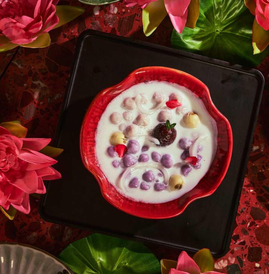 Ube-infused rice dumplings in warm coconut milk with lotus seeds, jujube, and young coconut.