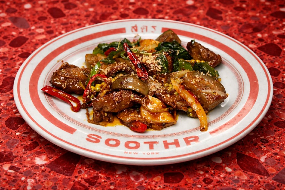Soothr signature sautéed shrimps in creamy egg curry sauce, red pepper, scallions, onion, and celery.